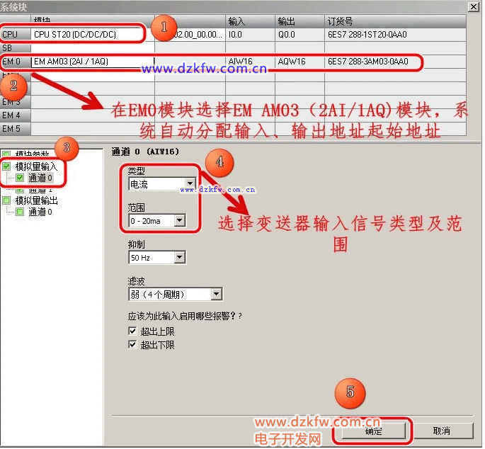 硬件配置:ST20 CPU 、模擬量擴(kuò)展模塊EM AM03、溫度變送器(輸出信號4-20ma,量程0℃-100℃)、PT100。