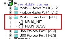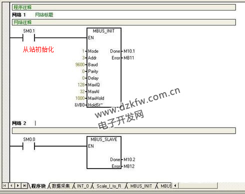 2.在主程序中添加Modbus Slave Port0從站塊(MBUS_INIT,MBUS_SLAVE)