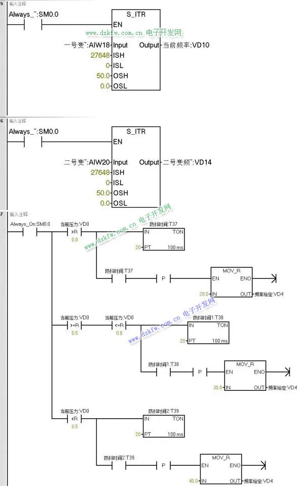 程序段 4 和 5 借助模擬量輸入庫文件,實現(xiàn)對當(dāng)前壓力值以及變頻器頻率反饋值的讀取。通過這種方式,程序能夠?qū)崟r獲取系統(tǒng)的關(guān)鍵運行參數(shù),為后續(xù)的控制決策提供準(zhǔn)確的數(shù)據(jù)支持。