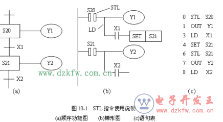STL和RET指令必須和狀態繼電器S配合使用才具有步進功能。STL也稱為步進觸點指令(占1步),STL的梯形圖符號用 表示,稱為STL觸點,它沒有動斷觸點。STL S20 和STL S21都是STL觸點。在梯形圖中,STL觸點與母線相連,使用STL指令后,母線移至觸點右側,其后需用LD、LDI、OUT等指令,直至出現下一條STL指令或出現RET指令。STL指令使新狀態繼電器置位,而前一狀態繼電器自動復位,其觸點斷開。圖10-1表明了順序功能圖、梯形圖、語句表三者之間的嚴格對應關系。步進結束指令RET也稱為步進返回指令,梯形圖符號用 表示。在一系列STL指令之后必須使用RET指令,以表示步進指令功能結束,母線恢復至原位。