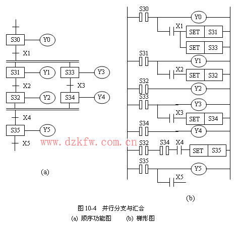 運用步進指令編寫順序控制程序時,首先應確定整個控制系統的流程,然后將復雜的任務或過程分解成若干個工序(狀態),最后弄清各工序成立的條件、工序轉移的條件和轉移的方向,這樣就可畫出順序功能圖。根據控制要求,采用STL、RET指令的步進順序控制可以有多種方式。如圖10-2所示是單流程順序功能圖。圖中M8002是特殊輔助繼電器,僅在運行開始時瞬間接通,產生初始脈沖。如圖10-3所示是選擇性分支與匯合狀態轉移方式。如圖10-4所示是并行分支與匯合狀態轉移方式。