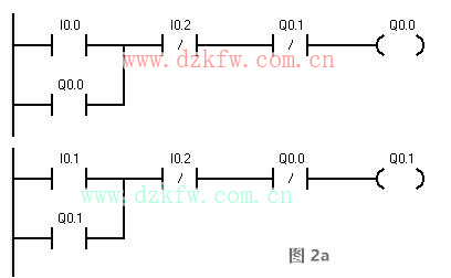 在如圖2所示的互鎖電路中,I0.0 I0.1是啟動按鈕,I0.2是停止按鈕。