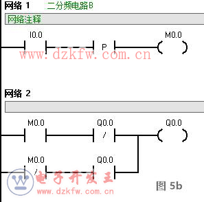 在圖5(a)中,10.0第一一個脈沖到來時,PC第一次掃描 ,MO.0為ON ,Q0.0為ON ,第二次掃描,00.0自鎖;10.0第二個脈沖到來時,PC第一次掃描,MO.0 為ON ,MO.1為ON,Q0.0斷開,第二次掃描,M0.0斷開,Q0.0保持斷開;依次類推。