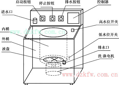 全自動洗衣機的洗衣桶(外桶)和脫水桶(內桶)是以同一中心安放的。外桶固定,作盛水用;內桶可以旋轉,作脫水(甩干)用。內桶的周圍有很多小孔,使內桶和外桶的水流相通。洗衣機的進水和排水分別由進水電磁閥和排水電磁閥來執行。進水時,通過控制系統將進水電磁閥打開,經進水管將水注入到外桶。排水時,通過控制系統將排水電磁閥打開,將水由外桶排到機外。洗滌正轉、反轉由洗滌電機驅動波盤的正、反轉來實現,此時脫水桶并不旋轉。脫水時,控制系統將離合器合上,由洗滌電機帶動內桶正轉進行甩干。高、低水位控制開關分別用來檢測高、低水位。啟動按鈕用來啟動洗衣機工作,停止按鈕用來實現手動停止進水、排水、脫水及報警。排水按鈕用來實現手動排水。其示意圖如圖1所示。