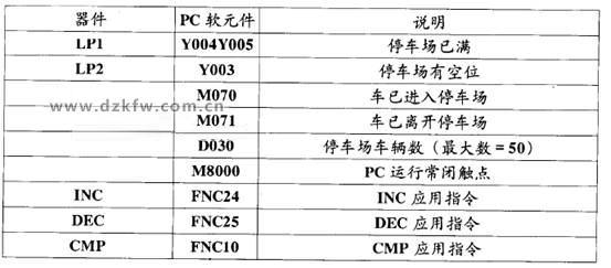CMP指令由特殊M線圈M8000驅動,使寄存器D030不斷地與已知能容納的最大車輛數作比較,當兩值相等時,停車場滿位。因此比較指令使燈LP1 (Y004)亮,表示停車場滿位。