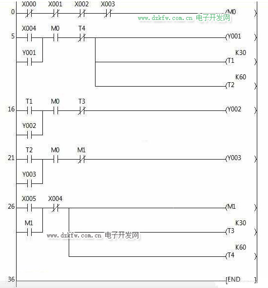 說明:該程序使用定時器(t)來做為延時啟動與停止的控制元件。