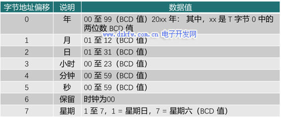 ②設(shè)置時(shí)鐘指令:設(shè)置實(shí)時(shí)時(shí)鐘指令通過由T 分配的 8字節(jié)時(shí)間緩沖區(qū)數(shù)據(jù)將新的時(shí)間和日期寫入到CPU。