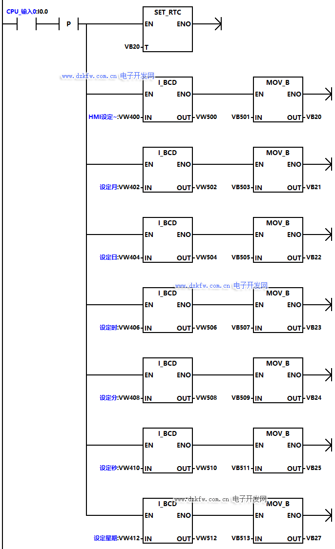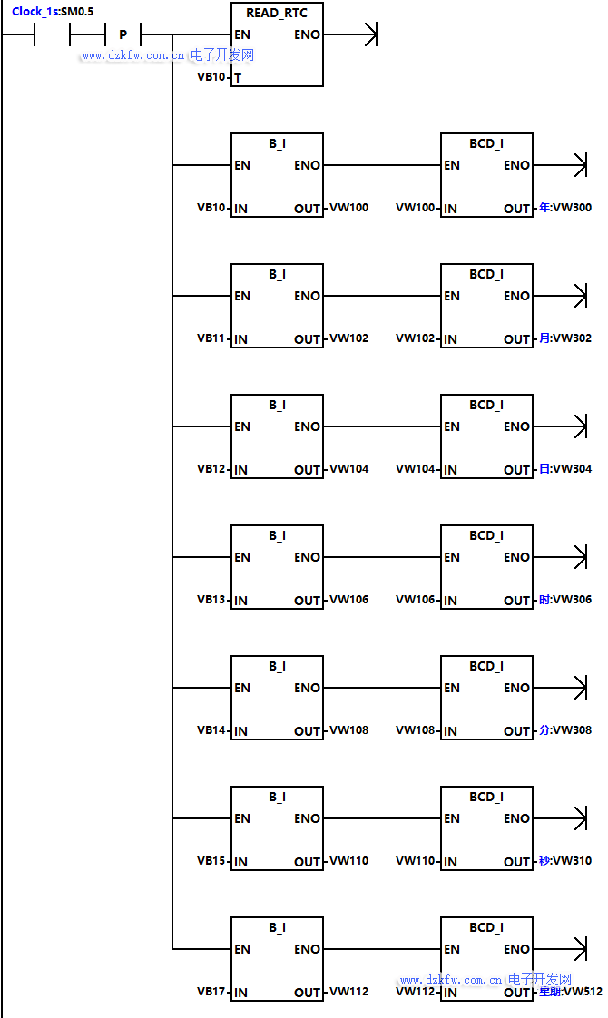 調(diào)用時(shí)鐘讀取指令并以系統(tǒng)時(shí)鐘SM0.5觸發(fā),由于讀取出來的均是BCD碼,因此需要通過轉(zhuǎn)換指令進(jìn)行轉(zhuǎn)換過后才是最終的日期時(shí)間。
