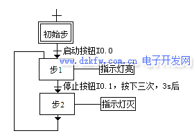 要求:一個指示燈,按下啟動按鈕指示燈點亮,按下停止按鈕3次的時候延時4s指示燈滅,請寫出梯形圖和順序功能圖