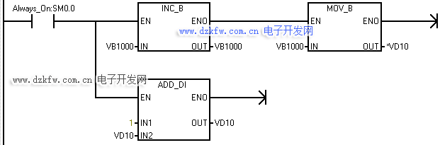 (3)寫入指針與指針偏移,當執行一次循環VB1000值加一,把VB1000寫入至VB100,當循環一次指針偏移一個字節。