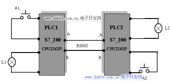 • PLC1的8個(gè)開關(guān)量輸入,I0.0~I0.7與PLC2的開關(guān)量輸出Q0.0~Q0.7一一對(duì)應(yīng),也就是說(shuō)上圖中的A1開關(guān)按下時(shí),PLC1的開關(guān)量輸入I0.0閉合,PLC2的輸出繼電器觸點(diǎn)Q0.0導(dǎo)通,L2點(diǎn)亮。