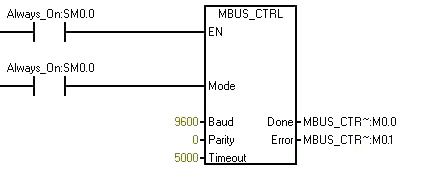 • 在程序中插入MBUS_CTRL指令,并在每次掃描時(shí)執(zhí)行MBUS_CTRL。您可以使用MBUS_CTRL指令初始化或更改Modbus通訊參數(shù)。