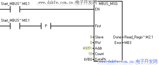 • 讀取從站數(shù)據(jù)在程序中插入MBUS_MSG指令,注意從站地址設(shè)置用一致;