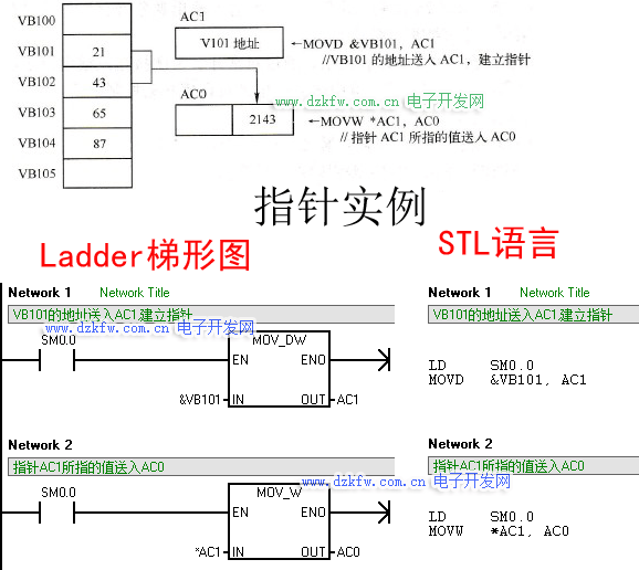 為了生成指針,必須用雙字傳送指令( MOVD)將要間接尋址的某存儲器的地址裝入用來作為指針的編程元件中,裝入的是地址而不是數(shù)據(jù)本身。例如,
