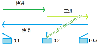 控制要求:某專用沖床動力頭的進給運動一個周期包括快進、工進和快退3步,動力頭的初始狀態停留在最左邊,限位開關I0.1狀態為1,啟動按鈕為I0.0,Q0.0~Q0.2控制3個電磁閥依次控制快進、工進和快退3步。