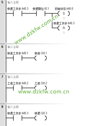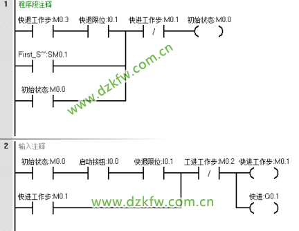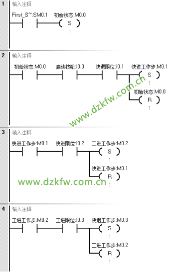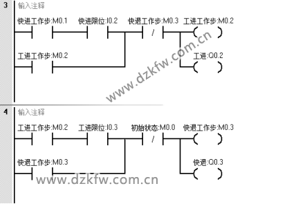 首先根據控制要求畫出順序功能圖,M0.0是初始狀態,M0.1是快進工作狀態步,M0.2是工進工作狀態步,M0.3是快退工作狀態步。