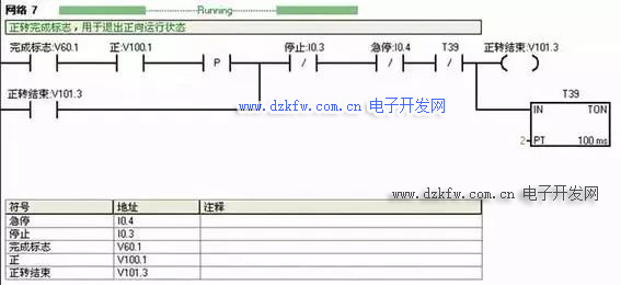 V100.1:正轉運行狀態;V101.2:復位完成標志。正反轉自動運行前必須復位完成;