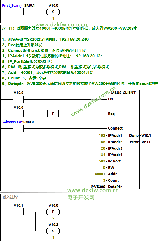 1、讀取服務器端40001~40005地址中的數據,放入到VW200~VW208中;