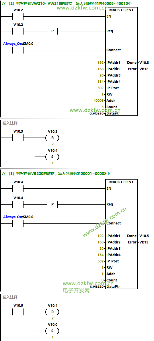 2、把VW210~VW218的數據,寫入到服務器的40006~40010中;