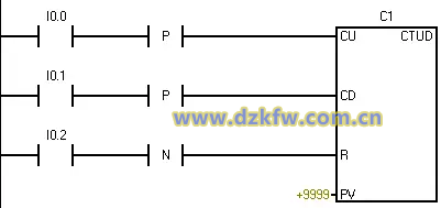 在此程序功能塊的輸入端“CU”處每輸入一個脈沖信號,對計數器加1;輸入端“CD”處每輸入一個脈沖信號,即對計數器加1;輸入端“R”處每輸入一個脈沖信號,即對計數器清零。