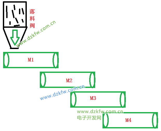 下面通過(guò)一個(gè)小案例來(lái)說(shuō)明移位寄存器指令的應(yīng)用。 如下圖所示為多級(jí)傳送帶的控制示意圖,控制要求如下:(1)落料閥打開(kāi)后,傳送電機(jī)M1馬上打開(kāi),延時(shí)6S后電機(jī)M2啟動(dòng)(2)電機(jī)2 啟動(dòng)后延時(shí)5S啟動(dòng)電機(jī)M3 ;電機(jī)M3啟動(dòng)后延時(shí)4S啟動(dòng)電機(jī)M4(3)若按下停止按鈕,落料閥需關(guān)閉,但為了防止物料累積,需根據(jù)各級(jí)傳送帶傳送的時(shí)間差別分別將4臺(tái)電機(jī)停止。(4)落料閥關(guān)閉6S后停止電機(jī)M1,5S后停電機(jī)M2, 4S后停電機(jī)M3,3S后停電機(jī)M4(5)按下緊急按鈕,所有輸出都要停止
