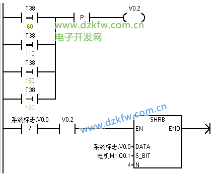但N若為正數(shù),位移動(dòng)表示從低位開(kāi)始;若為負(fù)數(shù),表示從高位開(kāi)始移動(dòng) 移位寄存器位指令將 DATA 的位值移入移位寄存器。S_BIT 指定移位寄存器最低有效位的位置。N 指定移位寄存器的長(zhǎng)度和移位方向(正向移位 = N,反向移位 = -N)。 將 SHRB 指令移出的每個(gè)位值復(fù)制到溢出存儲(chǔ)器位 SM1.1 中。 移位寄存器位由最低有效位 S_BIT 位置和長(zhǎng)度 N 指定的位數(shù)定義。