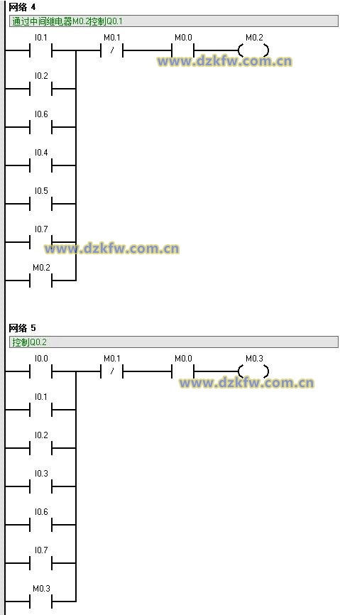 Network 9 LD M1.1 O Q0.5 AN I1.1 A M0.1 = Q0.5 Network 10 LD M1.2 O Q0.6 AN I1.1 A M0.1 = Q0.6 Network 11 LD M1.3 O Q0.7 AN I1.1 A M0.1 = Q0.7 Network 12 LD I0.1 O I0.2 O I0.6 O I0.4 O I0.5 O I0.7 O M0.5 AN M0.4 = M0.5 Network 13 LD I0.0 O I0.1 O I0.2 O I0.3 O I0.6