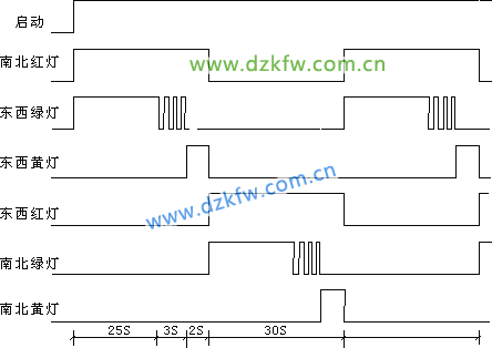 1 、北紅燈亮維持 30 秒,在南北紅燈亮的同時,東西綠燈也亮,并維持 25 秒,到 25 秒時,東西方向綠燈閃,閃亮 3 秒后,綠燈滅。在東西綠燈熄滅的同時,東西黃燈亮,并維持 2 秒,到 2 秒時,東西黃燈滅,東西紅燈亮。同時,南北紅燈熄滅,南北綠燈亮。