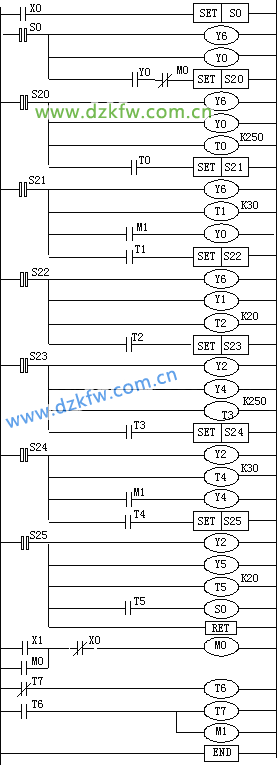 狀態轉移圖對應的步進梯形圖如圖 4所示,現簡單分析一下工作原理。當啟動按鈕SB1按下時,X0接通,S0置1,系統進入S0狀態,驅動Y6、Y0,使南北紅燈及東西綠燈同時亮,Y0接通,狀態轉移條件滿足,系統將轉移到S20狀態,在S20狀態下,Y6、Y0仍被驅動,即南北方向的紅燈及東西方向的綠燈繼續亮,同時驅動定時器T0,定時器的設定時間為25秒,25秒后,狀態轉移到S21,在S21狀態下,Y6繼續保持,但Y0受控于M1,而M1是由兩個定時器T6和T7控制,T6、T7組成一個1秒的震蕩器,即東西方向的綠燈閃亮。在本狀態下,同時也驅動定時器T1,定時時間為3秒,3秒時間到,狀態轉移到S22,在S22狀態下,Y6仍然被驅動,南北方向紅燈繼續亮,同時驅動T2、Y1,東西方向的綠燈滅,Y1口驅動的是東西方向的黃燈,故東西方向的黃燈亮,綠燈停。T2的定時時間為2秒,2秒時間到,狀態轉移到S23,在S23狀態下,同時驅動Y2、Y4及T3,東西方向的紅蛋亮,南北方向的綠燈亮,T3的定時時間為25秒,25秒時間到,狀態轉移到S24。在S24狀態下,驅動Y2、T4,東西方向的紅燈繼續亮,而南北方向的綠燈驅動口Y4受控于M1,M1是震蕩周期為1秒的震蕩器,故南北方向的綠燈閃亮。T4的定時時間是3秒,3秒后,狀態轉移到S25。在S25狀態下,同時驅動Y2、Y5及T5,即東西方向的紅燈、南北的黃燈亮,T5定時器的定時時間為2秒,2秒時間到,定時器的定時時間到,T5的觸點接通,狀態又重新轉移到S0。即南北方向的紅燈、東西方向的綠燈亮,系統將重復上述的動作順序,周而復始的繼續工作。當停止按鈕SB2被按下時,軟繼電器M0接通,其常閉觸點M0斷開,系統執行一周后,將停留在S0狀態,及保持南北方向的紅燈、東西方向的綠燈亮。