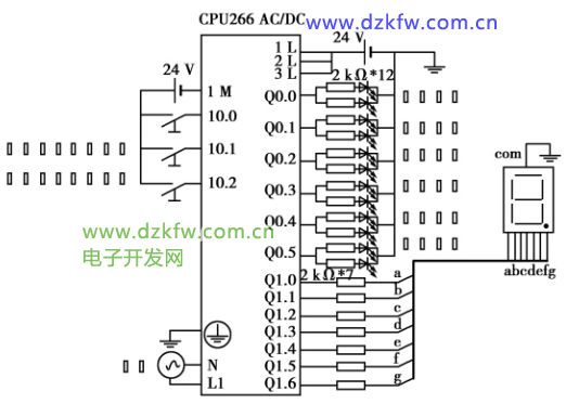 由于東西和南北方向的信號燈顯示時間一致,故采用信號燈并聯,以節約PLC輸出點數。考慮到發光二極管和七段數碼管的耐壓情況,采用在PLC的輸出端串聯2kΩ電阻限流,七段數碼顯示器使用SM4205共陰型數碼顯示器,相應的硬件接線圖形如圖2所示。