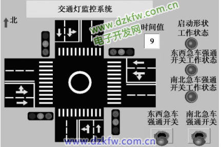 當有急車來時,急車強通開關接通,中斷原來的交通燈狀態,使急車通行的方向綠燈亮,直至急車通過為止。急車一過,將急車強通開關斷開,交通信號燈立刻轉為急車通行方向上的綠燈閃爍3s,隨后按照正常時序控制。如果南北和東西兩個方向先后有急車駛來,急車強通信號先響應先來的一方,隨后再響應另一方。