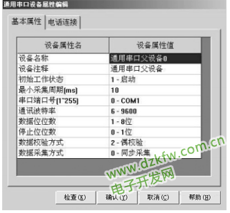 上位機PC通過MCGS組態軟件采集下位機PLC的信號,實時顯示十字路口東西南北的信號燈信息,同時通過對PLC的位存儲器操作也可以對路口交通燈進行控制。在MCGS組態環境的“設備窗口”中選擇“通用串口父設備”及“西門子S7-200PPI”,在“串口通訊父設備”根據西門子PPI通訊協議設置參數為:通訊波特率9600,數據位位數為8,停止位位數為1,數據校驗方式為偶校驗,串口通訊號為com1,最小采樣周期為10ms,如圖5所示。