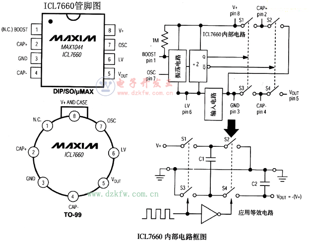 ICL7660提供DIP、SO,μMAX, TO-99等封裝形式。ICL7660中文資料管腳圖,內部電路與引腳功能如下: