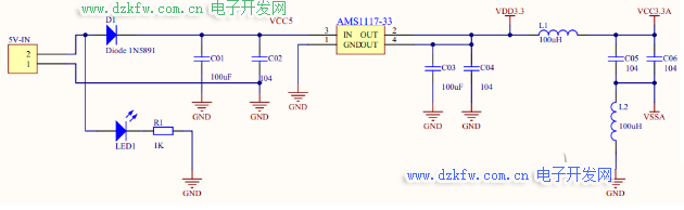 以下是用穩壓芯片將5V的電源轉換成3.3V的電壓電路原理圖。