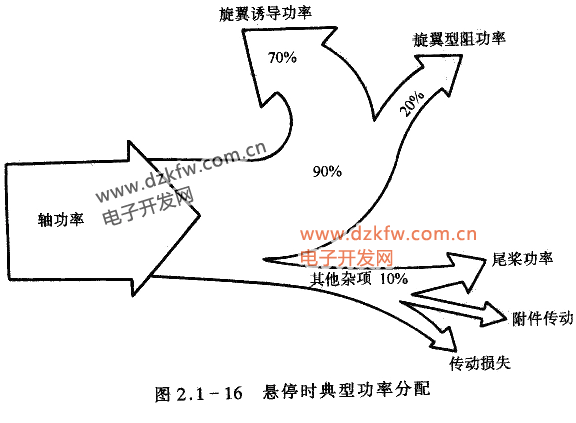 從能量轉換的觀點分析,直升機在懸停狀態時(如下圖) 發動機輸出的軸功率,其中約90%用于旋翼,分配給尾槳、 傳動裝置等消耗的軸功率加起來約占 10%。旋翼 所得到的90%的功率當中,旋翼型阻功率又用去20%,旋翼用于 轉變成氣流動能以產生拉力的誘導功率僅占70%。