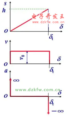 (1)等速運(yùn)動規(guī)律:從動件在推程或回程作等速運(yùn)動,存在剛性沖擊。