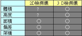 相較之下三次元檢查設(shè)備可以同時(shí)獲得體積、面積、高度等數(shù)據(jù),表1是二次元檢查與三次元檢查設(shè)備的功能比較一覽。