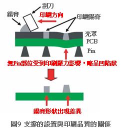 圖9是基板下方支撐的設(shè)置與印刷質(zhì)量的關(guān)系,以往數(shù)據(jù)化管理基板下方支撐的適宜性很困難,改用三次元檢查儀之后,可以根據(jù)錫膏印刷量檢討基板下方支撐的適宜性。