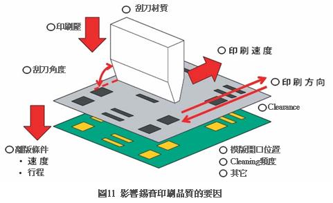 如上所述使用三次元檢查儀,可以根據(jù)錫膏印刷量量測管理基板下方支撐的適宜性,透過基板下方支撐的適宜性管理,除了定位之外決定印刷壓力之外,對印刷速度、接觸角等印刷條件設(shè)定也非常有效,圖11是影響錫膏印刷質(zhì)量的要因圖。