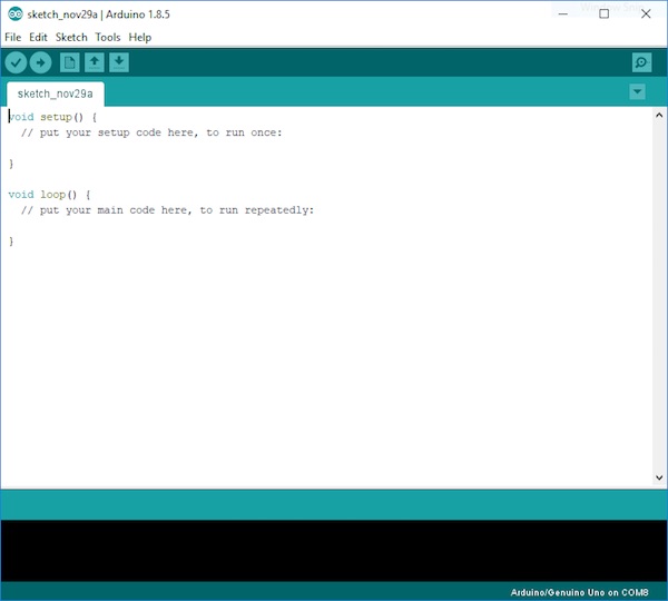 如果一切都去了計劃,你應該看到Arduino IDE加載一個空白程序,如下所示。