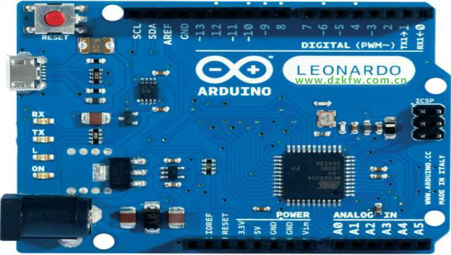 ArduinoLeonardo以功能強大的ATmega32U4為基礎。此款板卡提供20路數字輸入/輸出引腳(其中7路可用作PWM輸出,12路用作模擬輸入),一個16MHz晶體振蕩器、微型USB連口、一個電源插座、一個ICSP接頭和一個復位按鈕。