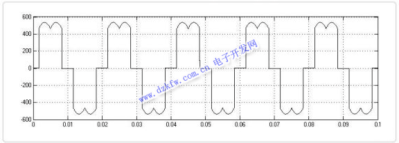 變頻器的逆變輸出側,由SPWM波控制由IGBT等全控型器件組成的橋式電路,從而形成電壓、頻率可調的三相交流電。變頻器輸出的線電壓是正弦脈寬、幅值相等的矩形波(PWM波),如圖所示。