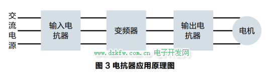 直流電抗器又稱為平波電抗器,直流電抗器串聯在變頻器的直流回路中。它的功能就是削減電流中的諧波成分,保證整流電流的連續,減小電流的脈動值,提高變頻器的功率因數,減少和防止三相整流橋和濾波電容因為沖擊電流造成的損壞,如圖3所示。