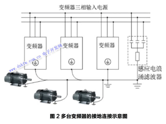 (2)可靠的接地,抑制或者消除諧波最有效的措施是接地,目前很多生產廠家的變頻器都采用鐵殼,利用機殼進行屏蔽,這樣既能屏蔽交流調速系統向外傳遞諧波,又能防止外界諧波對變頻器本身的干擾,如圖2所示。