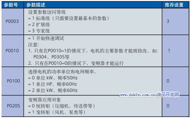 2、設(shè)置電動機(jī)參數(shù),為了使電動機(jī)和變頻器相匹配,需要設(shè)置電動機(jī)參數(shù)。電動機(jī)參數(shù)設(shè)置見下表。電動機(jī)參數(shù)設(shè)定完成后,設(shè)P0010=0,變頻器當(dāng)前處于準(zhǔn)備狀態(tài),才可正常運(yùn)行。