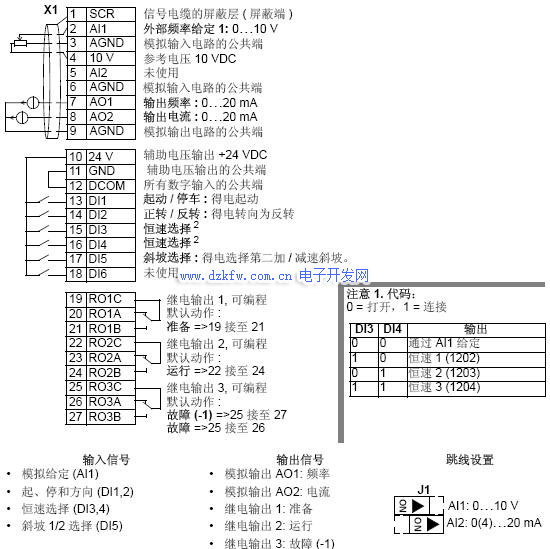 ①在變頻器通電之前,檢查確認功率電纜、控制端子的接線正確無誤。下圖的是ABB標準宏的端子接線與定義圖。
