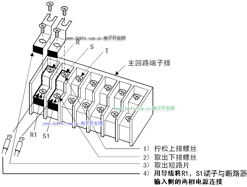 R1、S1端子內接控制電路,外部通過短路片與R、S端子連接,R、S端的電源通過短路片由R1、S1端子提供給控制電路作為電源。如果希望R、S、T端無工頻電源輸入時控制電路也能工作,可以取下R、R1和S、S1之間的短路片,將兩相工頻電源直接接R1、S1端。