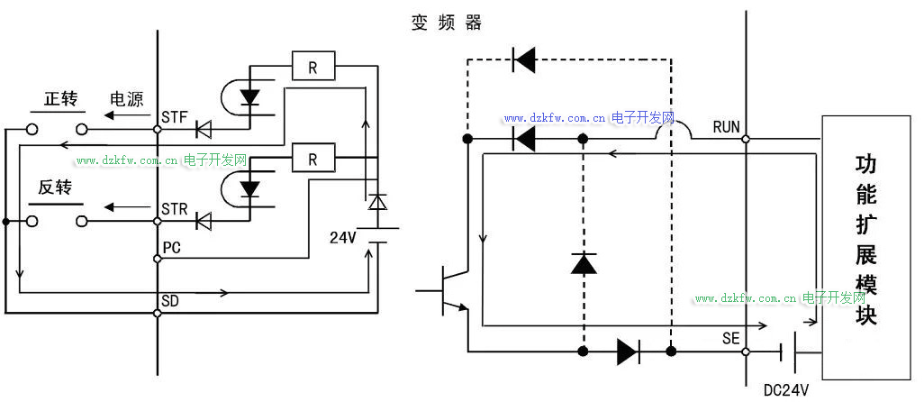 圖中的正轉按鈕接在STF端子與SD端子之間,當按下正轉按鈕時,變頻器內部電源產生電流從STF端子流出,經正轉按鈕從SD端子回到內部電源的負極,該電流的途徑如圖所示。另外,當變頻器內部三極管集電極開路輸出端需要外接電路時,需要以SE端作為公共端,外接電路的電流從相應端子(如圖中的RUN端子)流入,在內部流經三極管,最后從SE端子流出,電流的途徑如圖中箭頭所示,圖中虛線連接的二極管表示在漏型控制邏輯下不導通。