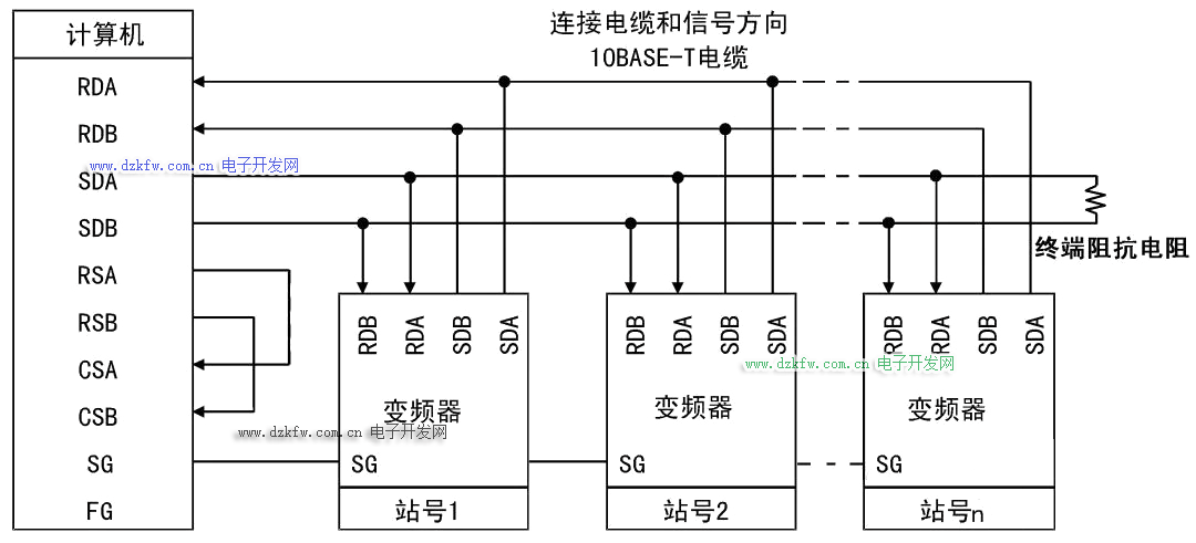 計算機與多臺變頻器連接時,PU接口的連接如下圖所示。圖中分配器的功能是將一路信號分成多路信號,另外,由于傳送速度、距離的原因,可能會出現信號反射造成通信障礙,為此可給最后一臺變頻器的分配器安裝終端阻抗電阻(100Ω)。