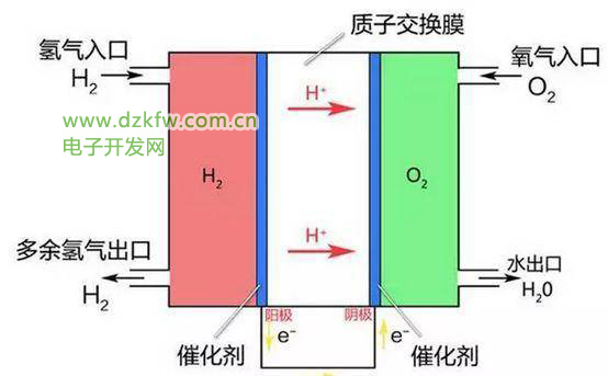 由于質子交換膜只能傳導質子,因此氫離子(即質子)可直接穿過質子交換膜到達陰極,而電子只能通過外電路才能到達陰極。當電子通過外電路流向陰極時就產生了直流電。